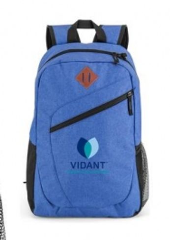 300D heathered polyester and 600D backpack with angled front pocket. PU leatherette patch; mesh water bottle pocket; padded back and adjustable shoulder straps.